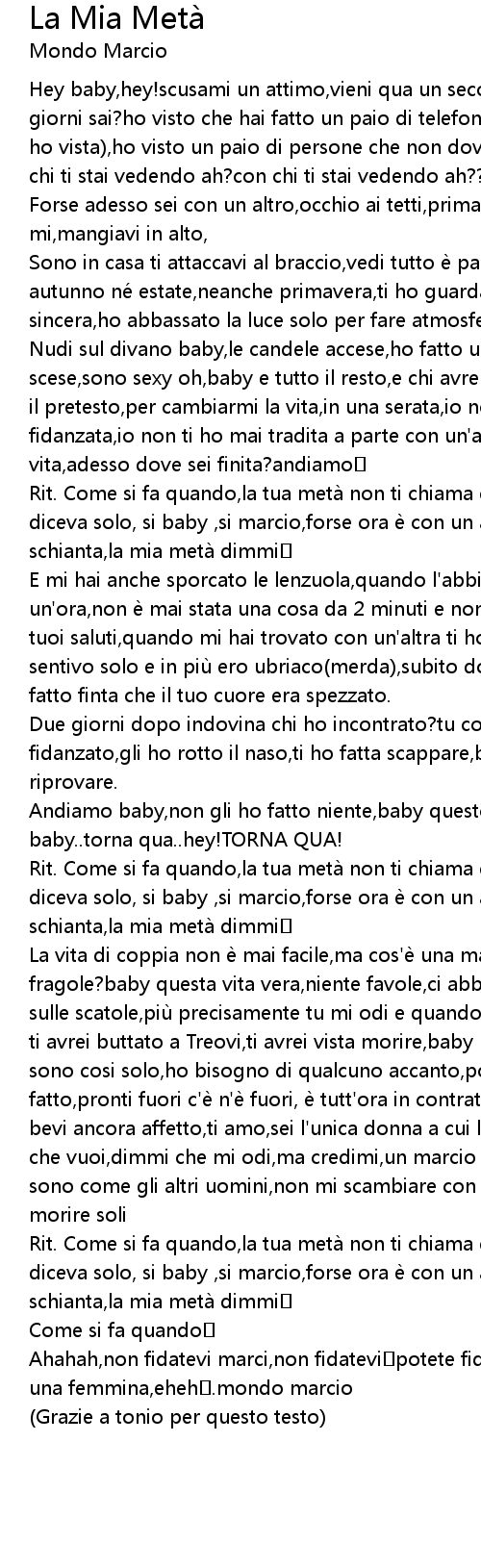 | Rit. Come si fa quando,la tua metà non ti chiama e non ti sta accanto,prima diceva solo, si baby ,si marcio,forse ora è con un altro,che schianto,che schianta,la mia metà dimmi | |