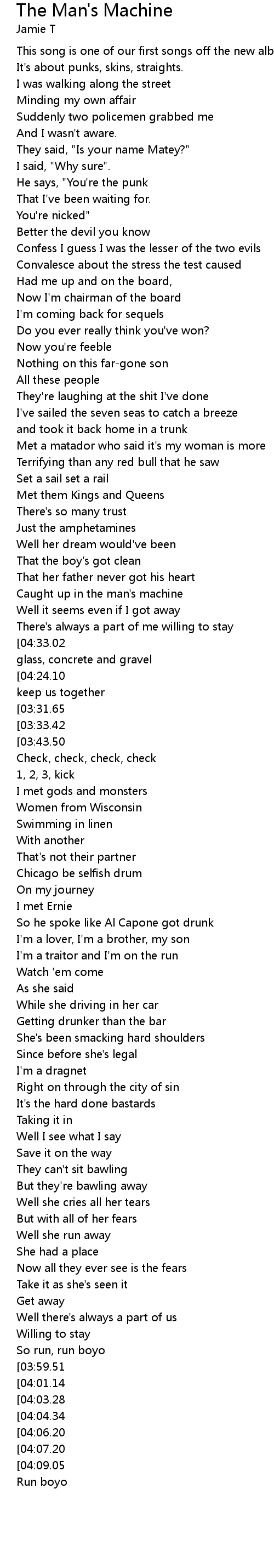 | [04:38.21][04:33.02][04:26.89][04:22.05][03:40.79][03:35.28][03:29.16][03:23.85][02:19.91][02:14.50][02:08.25][02:02.89] |