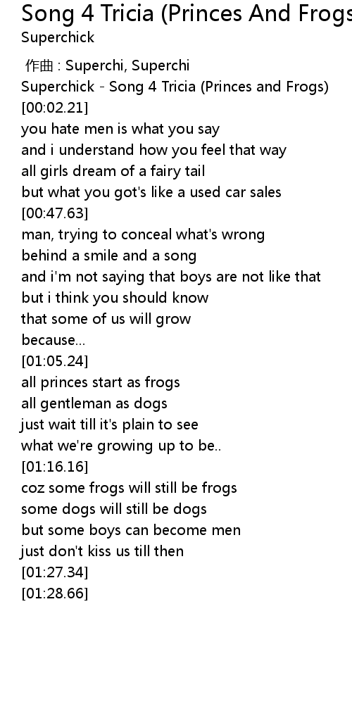 | [00:00.94] | Superchick Song 4 Tricia Princes and Frogs |