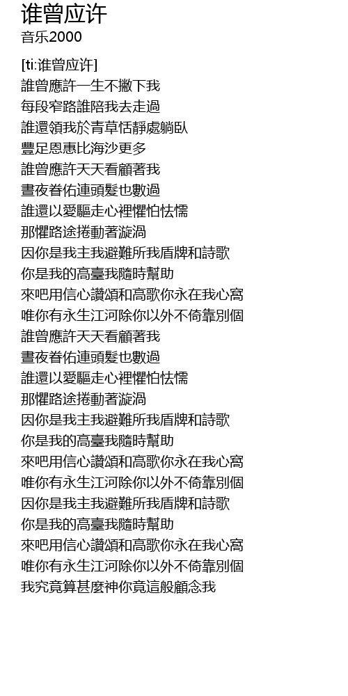 | [00:27.80] | 誰曾應許一生不撇下我 |