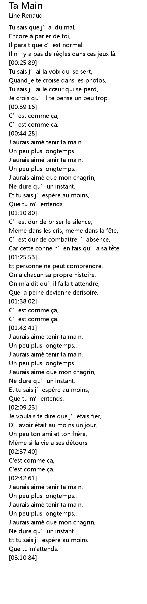 | [00:49.94] | J' aurais aime tenir ta main, |
