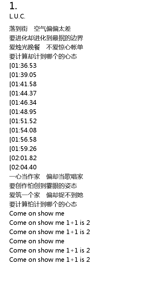 | [03:17.02][01:54.08][00:51.79] | Come on show me 1+1 is 2 |