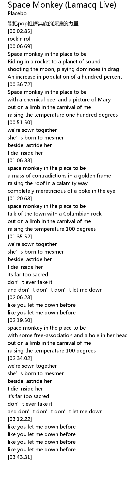 | [00:22.67] | Space monkey in the place to be |