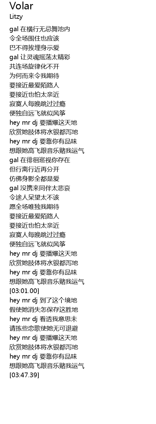 | [02:45.37] | hey mr dj yào bō bào zhè tiān dì |