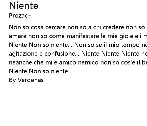 | Non so cosa cercare non so a chi credere non so perche esistere non so come amare non so come manifestare le mie gioie e i miei dolori... Niente Niente Niente Non so niente... Non so se il mio tempo non riesco a starci dentro e agitazione e confusione... Niente Niente Niente non so niente... non so niente neanche che mi e amico nemico non so cos'e il bene il male... Niente Niente Niente Non so niente... | |