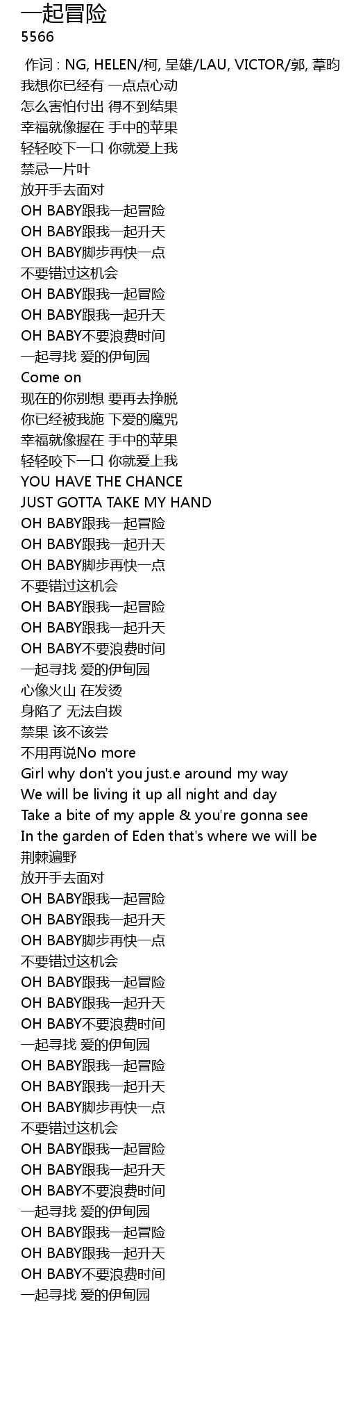 | [01:37.40] | OH BABY gēn wǒ yì qǐ mào xiǎn |