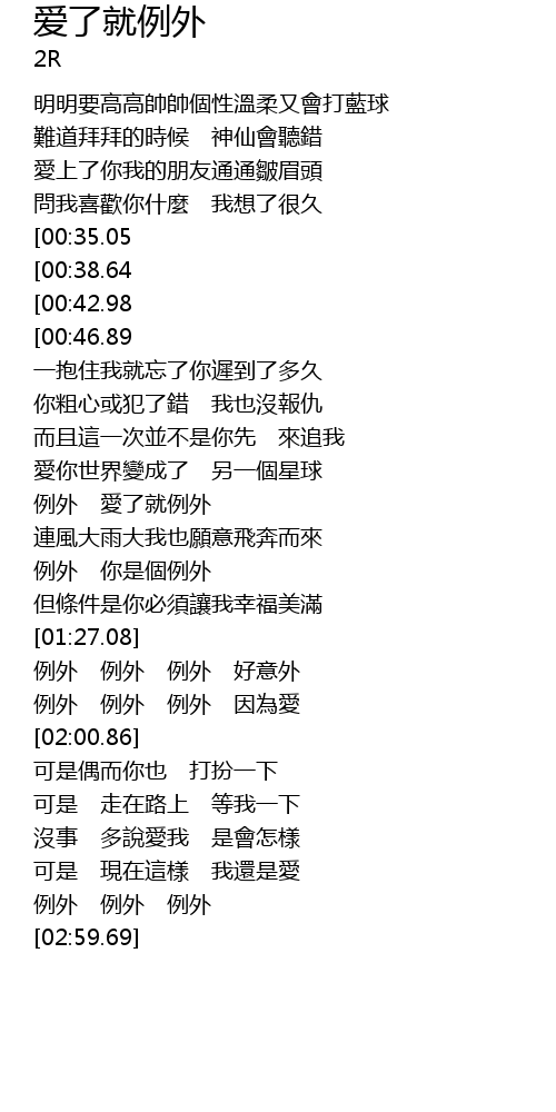 | [02:07.14][00:35.05] | 例外 愛了就例外 |