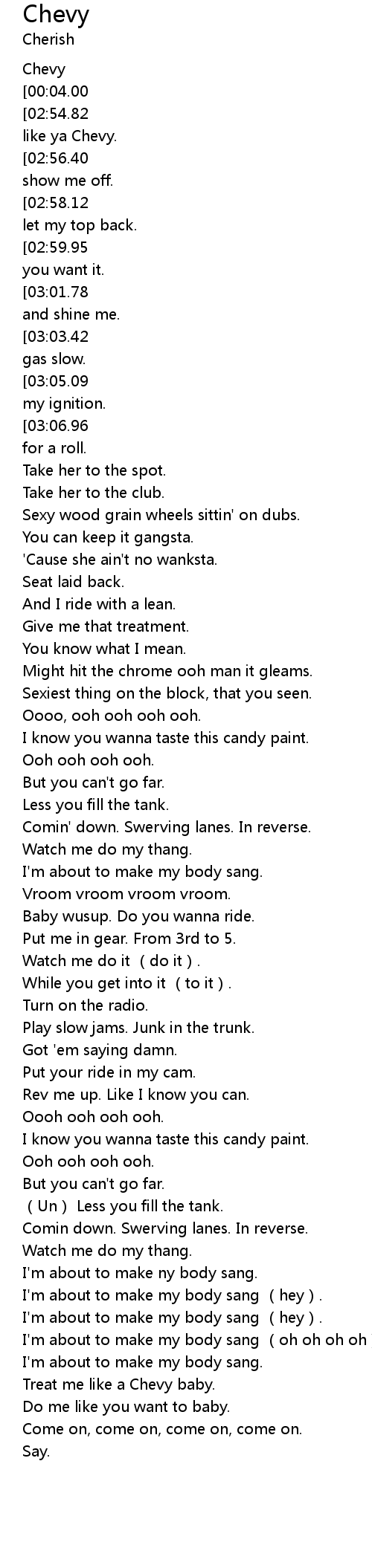 | [03:08.74][02:54.82][02:12.27][01:58.24][01:15.68][01:01.60][00:19.46] | Treat me like ya Chevy. |