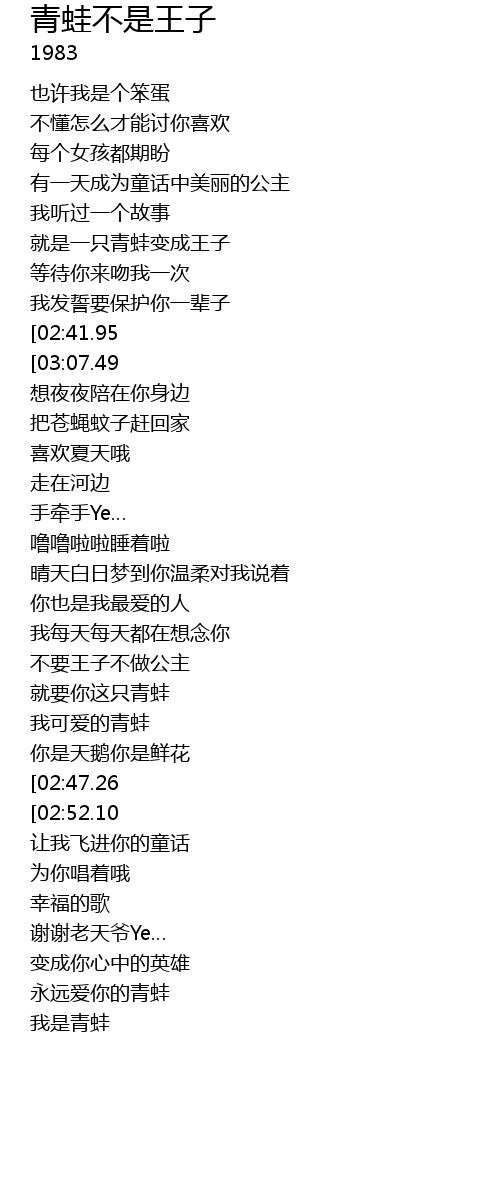 | [00:50.73][02:41.95][03:02.27][03:12.37] | 我是青蛙你的青蛙 |