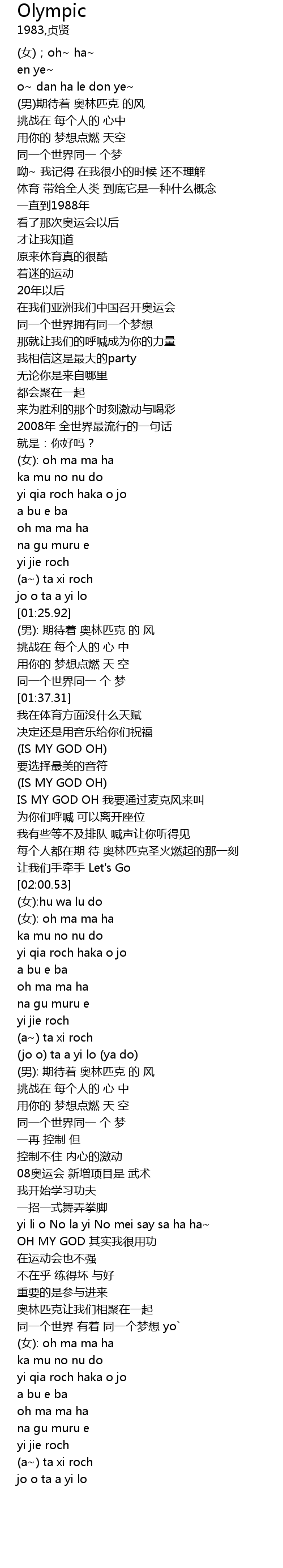 | [00:19.18] | (男)期待着 奥林匹克 的风 |