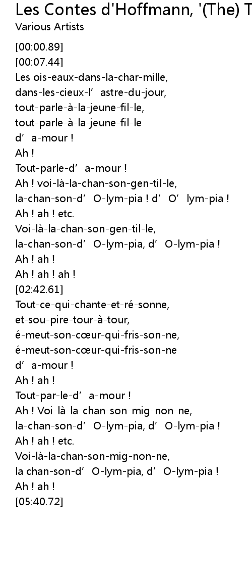 | Song | Les Contes d'Hoffmann, '(The) Tales of Hoffmann', PROLOGUE: Les oiseaux dans la charmille (Doll's Song) |