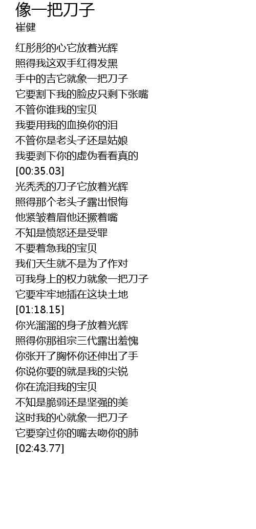| [02:39.41] | 这时我的心就象一把刀子 |