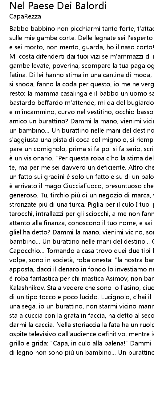 | Babbo babbino non picchiarmi tanto forte, t' attacchi al vino e giù coi calci sulle mie gambe corte. Delle legnate sei l' esperto ma ti avverto, toccami ancora e sei morto, non mento, guarda, ho il naso corto! Che, mi diverto a dir cazzate? Mi costa difenderti dai tuoi vizi se m' ammazzi di mazzate. Mammà se la dette a gambe levate, poverina, scompare la tua paga ogni mese, in paese la chiamano fatina. Di lei hanno stima in una cantina di moda, c'è un palo e mezza nuda vi si snoda, fanno la coda per questo, io me ne vergogno, faccio un sogno e vi ci resto: la mamma casalinga e il babbo un uomo saggio e onesto. Ma qualche bastardo beffardo m' attende, mi da del bugiardo, m' offende, ne sento lo sguardo e m' incammino, curvo nel vestitino, occhio basso, capo chino, chi vuole come amico un burattino? Dammi la mano, vienimi vicino, sono di legno non sono più un bambino... Un burattino nelle mani del destino... Lucignolo l' artista s' aggiusta una pista di coca col mignolo, si riempie le tempie di nubi empie, pare un comignolo, prima si fa poi si fa serio, scrive due cazzate sul diario, è un visionario. " Per questa roba c' ho la stima della gente"... Contento per te, ma per me sei davvero un deficiente. Altro che matto, meo amigo, com'è che un fatto sui gradini è solo un fatto e su di un palco è sempre un figo? In TV è arrivato il mago CiucciaFuoco, presuntuoso che vende un mondo sano e generoso. Tu, tirchio più di un negozio di marca, va alla forca, sai di stronzate più di una turca. Piglia per il culo I tuoi pupazzi, numeri e tarocchi, intrallazzi per gli sciocchi, a me non fanno effetto, piuttosto attento alla finanza, conoscono il tuo nome, e sai chi è l' infamone che gliel' ha detto? Dammi la mano, vienimi vicino, sono di legno non sono più un bambino... Un burattino nelle mani del destino... Capocchio... Capocchio... Capocchio... Tornando a casa trovo quei due tipi là, lui è il gatto, lui è la volpe, sono in società, roba onesta: " la nostra banca ha istituito un fondo apposta, dacci il denaro in fondo lo investiamo nell' azione giusta...". Questa è roba fantastica per chi mastica Asimov, non baratto I miei soldi con I Kalashnikov. Sta a vedere che sono io l' asino, ciuco figlio di un ciucco, amico di un tipo tocco e poco lucido. Lucignolo, c' hai il nome di uno stoppino, tu sei una sega, io un burattino, non starmi vicino mannaggia. persino il Ciuccia, che sta a cuccia con la grata in faccia, ha detto al secondino che se esce viene a darmi la caccia. Nella storiaccia la fata ha un ruolo incisivo: mamma lap dance ospite televisivo dall' audience definitivo, mentre io vivo una pena. Arriva il grillo e grida: " Capa, in culo alla balena!" Dammi la mano, vienimi vicino, sono di legno non sono più un bambino... Un burattino nelle mani del destino... |