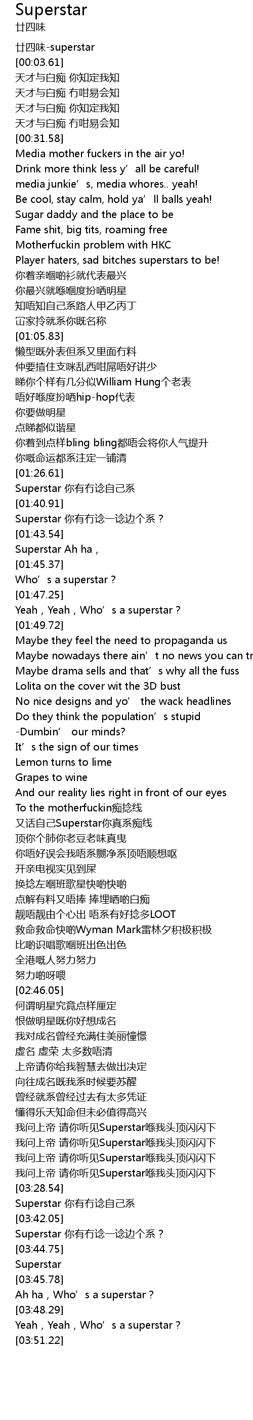 | [01:29.97] | Superstar 你有冇谂一谂边个系? |