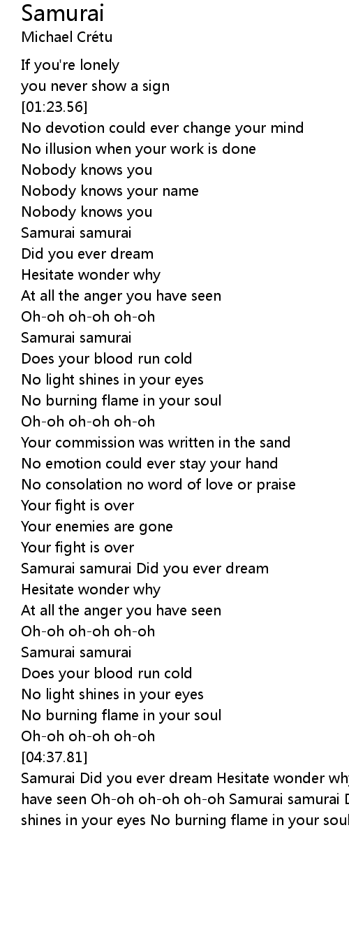 Samurai Did you ever dream Hesitate wonder why At all the anger you have seen Oh-oh oh-oh oh-oh Samurai samurai Does your blood run cold No light shines in your eyes No burning flame in your soul Oh-oh oh-oh oh-oh |