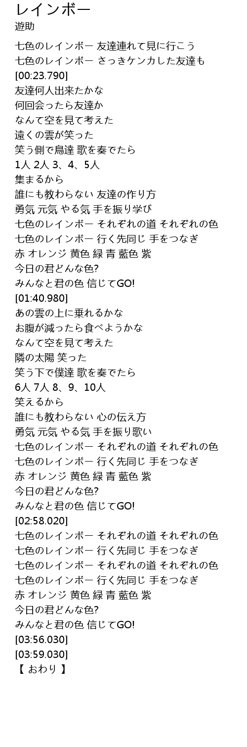 | [02:35.110] | 七色のレインボー 行く先同じ 手をつなぎ |