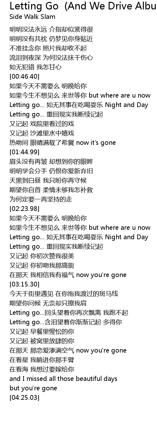 | [03:40.10] | Letting go... hán lèi wàng zhe nǐ jiàn jiàn jì qǐ duō de nǐ |