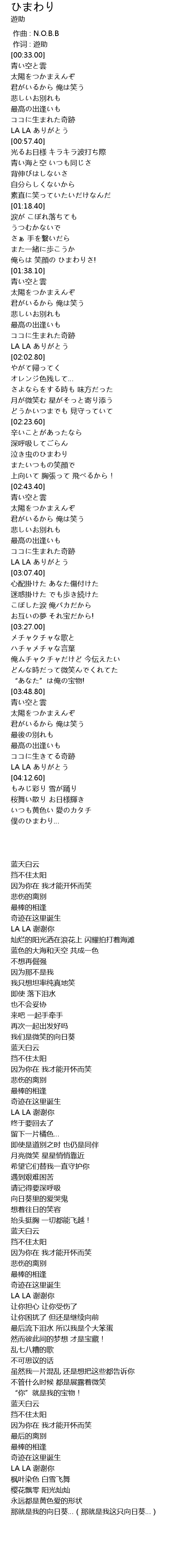 | [01:33.22] | 俺らは 笑顔の ひまわりさ! |