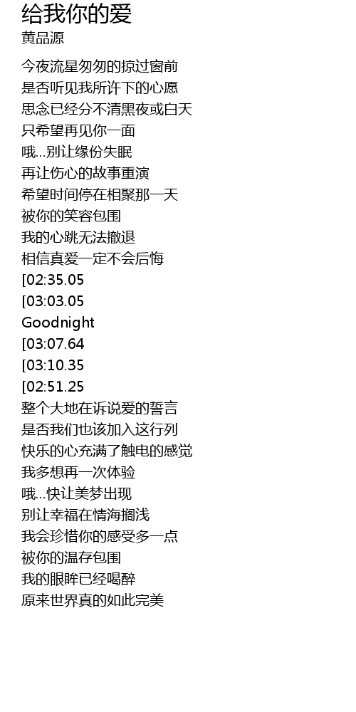| [03:24.37][03:03.05][02:40.45][01:12.81] | 让(有)我陪你 今夜 Don't Say Goodnight |