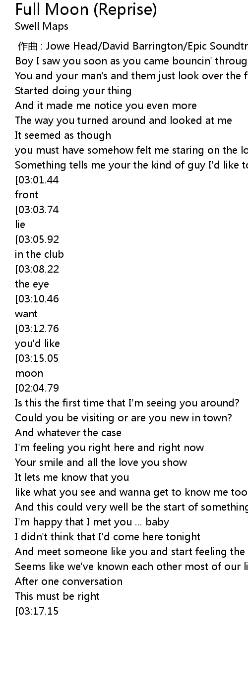 | [03:32.91][03:15.05][02:56.76][02:20.73][02:02.60][01:08.25] | It must be a full moon |