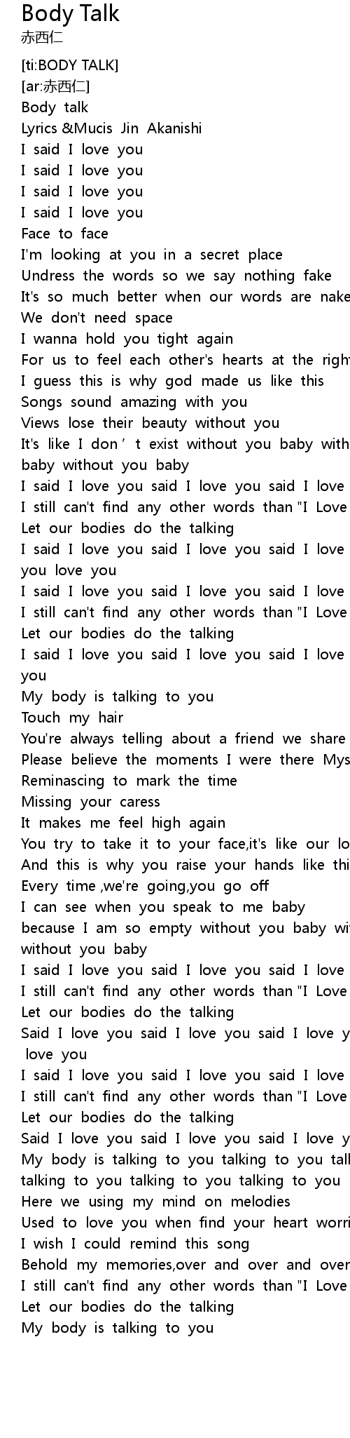 | [03:29.872] | My body is talking to you talking to you talking to you |