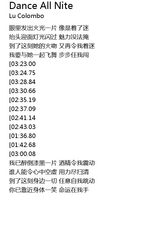 | [03:54.57][03:30.66][02:31.12][01:19.61] | Dance all nite re li zai wo xin |