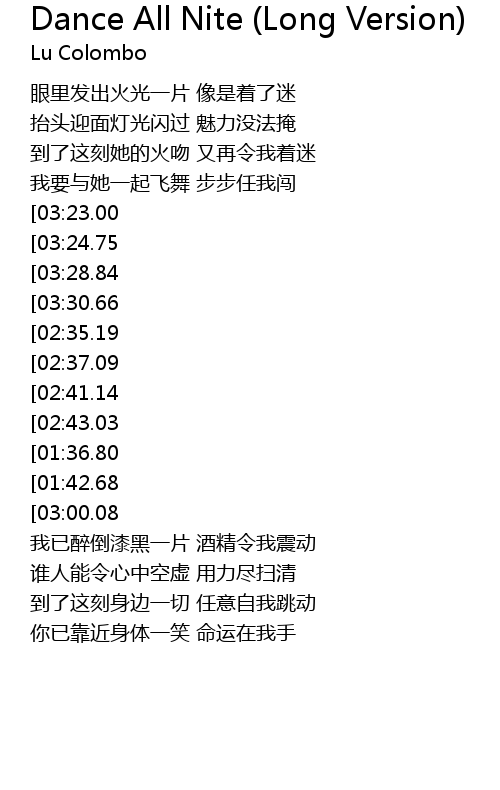 | [03:48.55][03:24.75][02:25.20][01:13.65] | Dance all nite 绝不可以终止 |