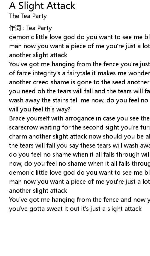 | Brace yourself with arrogance in case you see the light you' ll be hanging like a scarecrow waiting for the second sight you' re furious with envy the token of the charm another slight attack now should you be alarmed oh the tears will fall and the tears will fall you say these tears will wash away the stains tell me now, do you feel no shame when it all falls through will you feel this way? tell me now, do you feel no shame when it all falls through will you feel this way? demonic little love god do you want to see me bleed anarchistic little beggar man now you want a piece of me you' re just a lot of talk without a lot of sense another slight attack | |