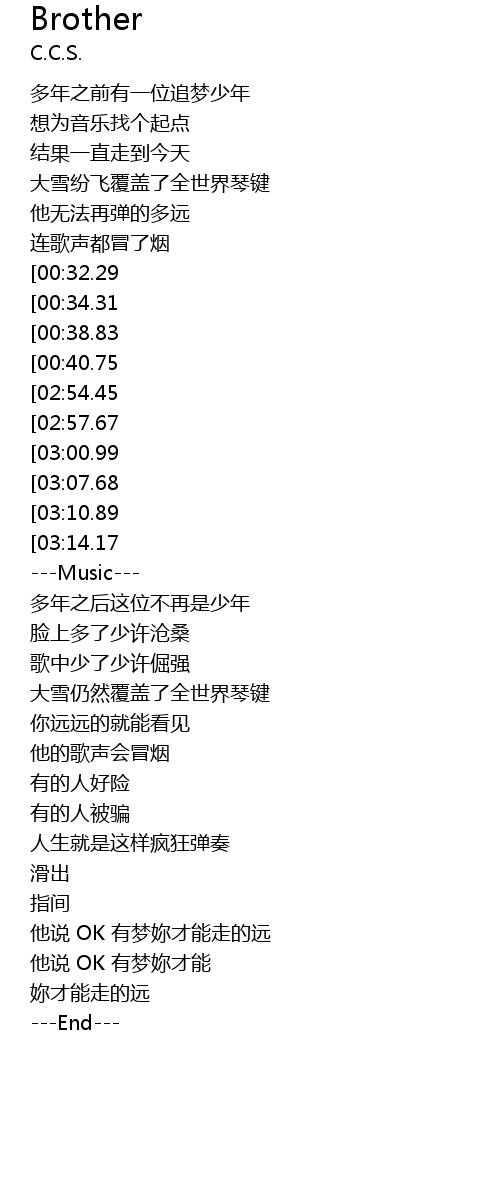 | [03:20.80][02:54.45][02:14.63][00:48.61] | ge ge shuo Byebye My Brother |