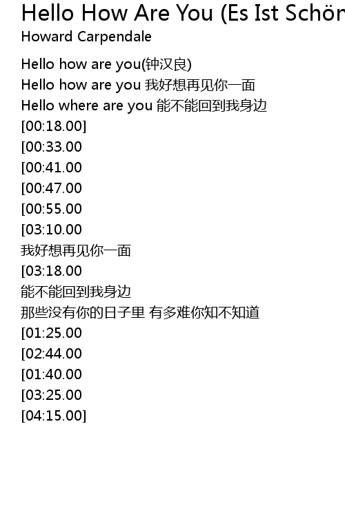 | [03:40.00][03:10.00][02:21.00][01:02.00] | Hello how are you wǒ hǎo xiǎng zài jiàn nǐ yī miàn |