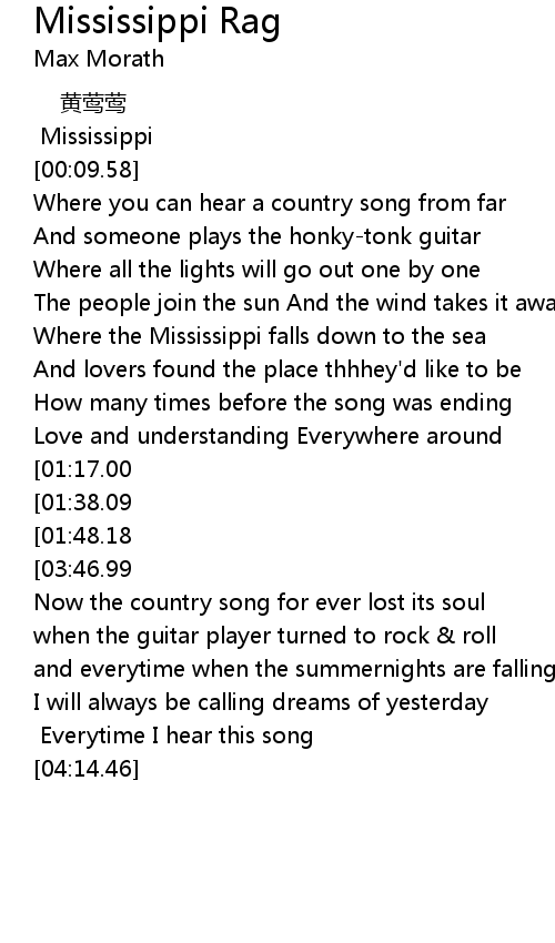 | [03:04.32][01:17.00] | Mississippi I' ll remember you Whenever I should go away |