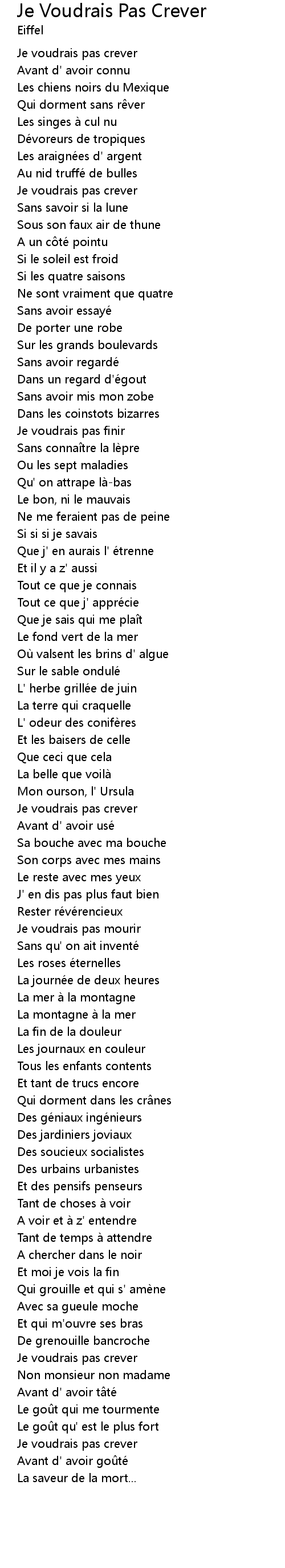| Song | Je Voudrais Pas Crever |