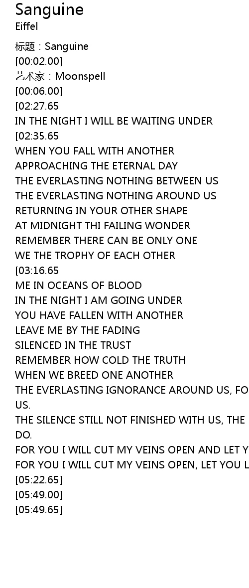| [01:38.65][03:16.65][05:06.65][05:14.65][05:30.65] | SANGUINE YOUR LOVE COMES TO ME IN OCEANS OF BLOOD |