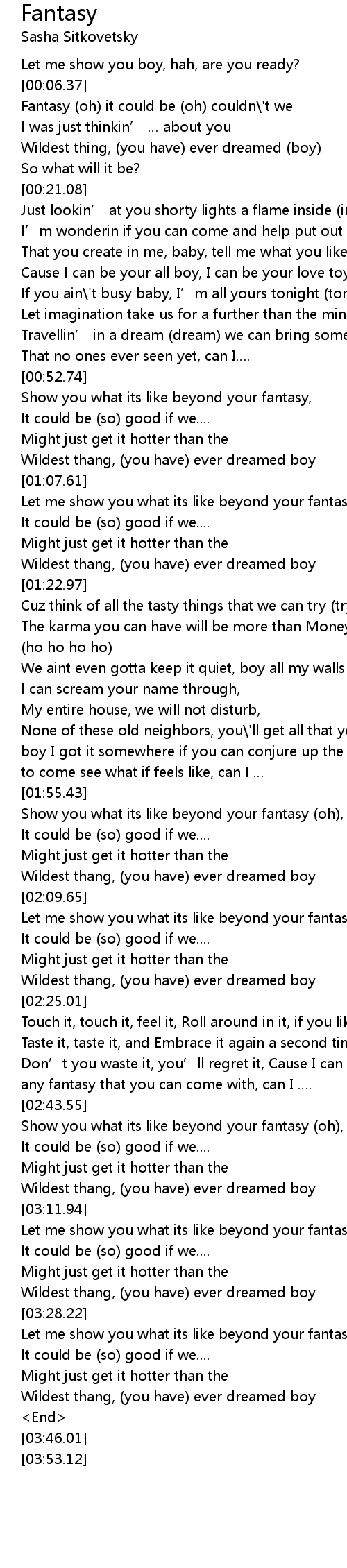 | [00:07.74] | Fantasy (oh) it could be (oh) couldn\'t we |