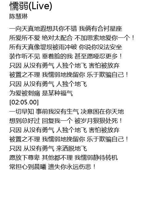 | [02:27.07] | 只因 从没有勇气 人独个地飞 害怕被放弃 |
