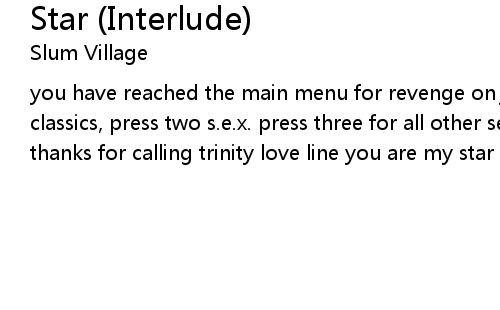 | you have reached the main menu for revenge on jealous niggas, press one hip hop classics, press two s.e.x. press three for all other selections, press star thanks for calling trinity love line you are my star |