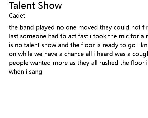 | the band played no one moved they could not find the groove i knew that wouldn't last someone had to act fast i took the mic for a moment that's when i sang this is no talent show and the floor is ready to go i know you want to dance so come on while we have a chance all i heard was a cough i started to walk off then people wanted more as they all rushed the floor i told the band to follow that's when i sang |