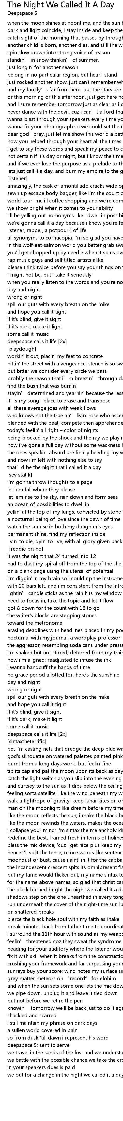 | run underneath the cover of the nighttime sun lungs broken and scraped spoken on shattered breaks | |