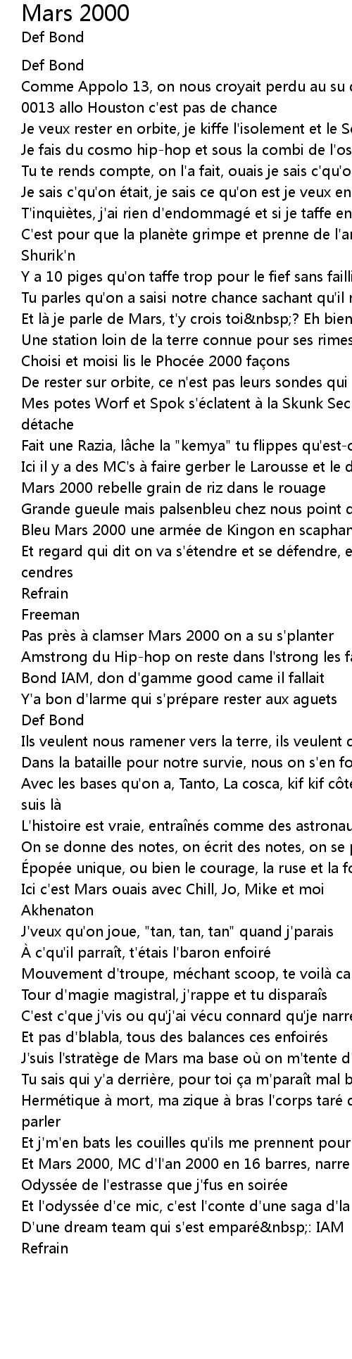 | J' suis l' strate ge de Mars ma base ou on m' tente d' me carrer | |