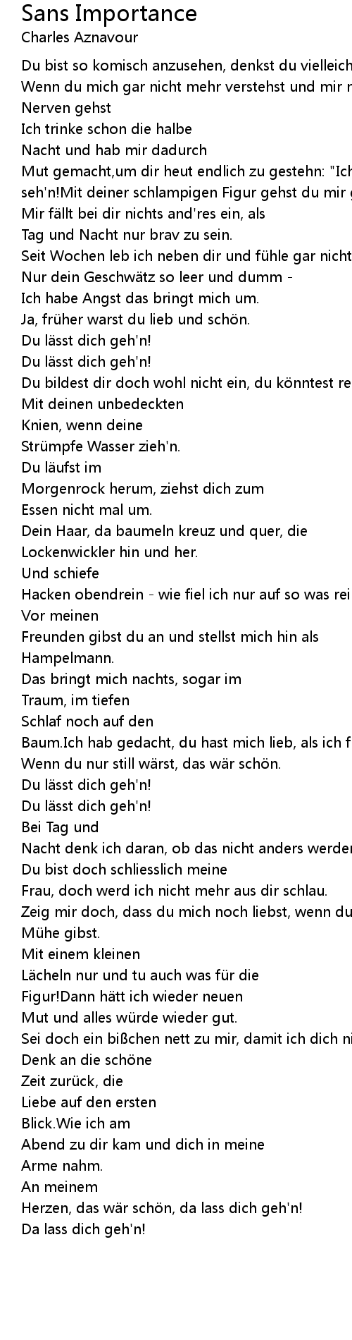 | Mut gemacht,um dir heut endlich zu gestehn: "Ich kann dich einfach nicht mehr seh'n!Mit deiner schlampigen Figur gehst du mir gegen die Natur." | |