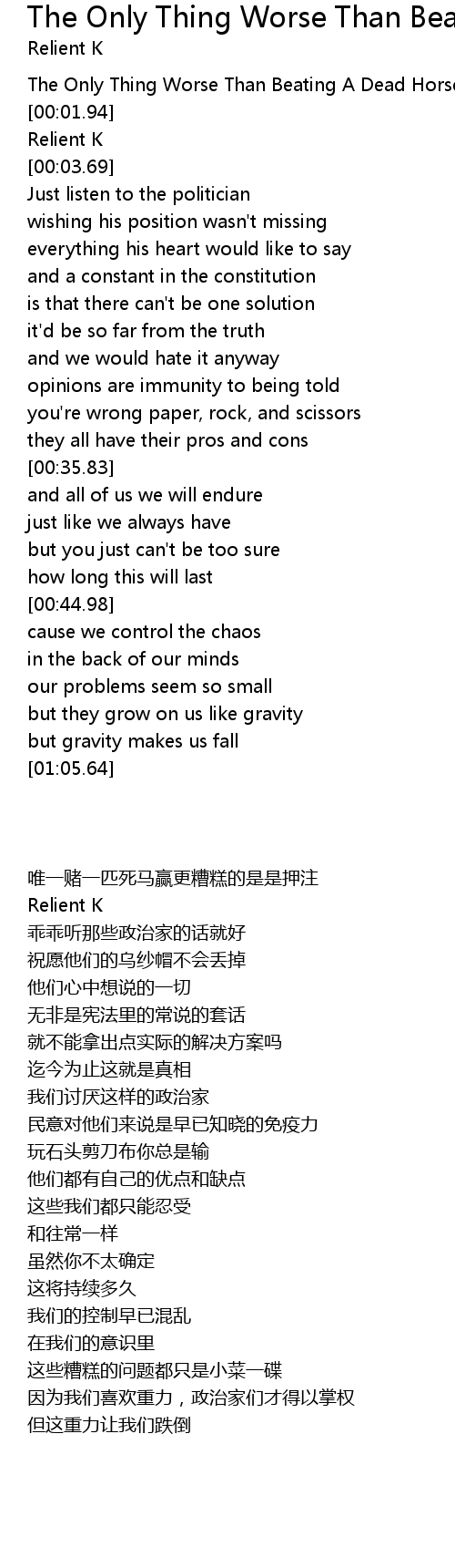 | [00:00.93] | The Only Thing Worse Than Beating A Dead Horse Is Betting On One |