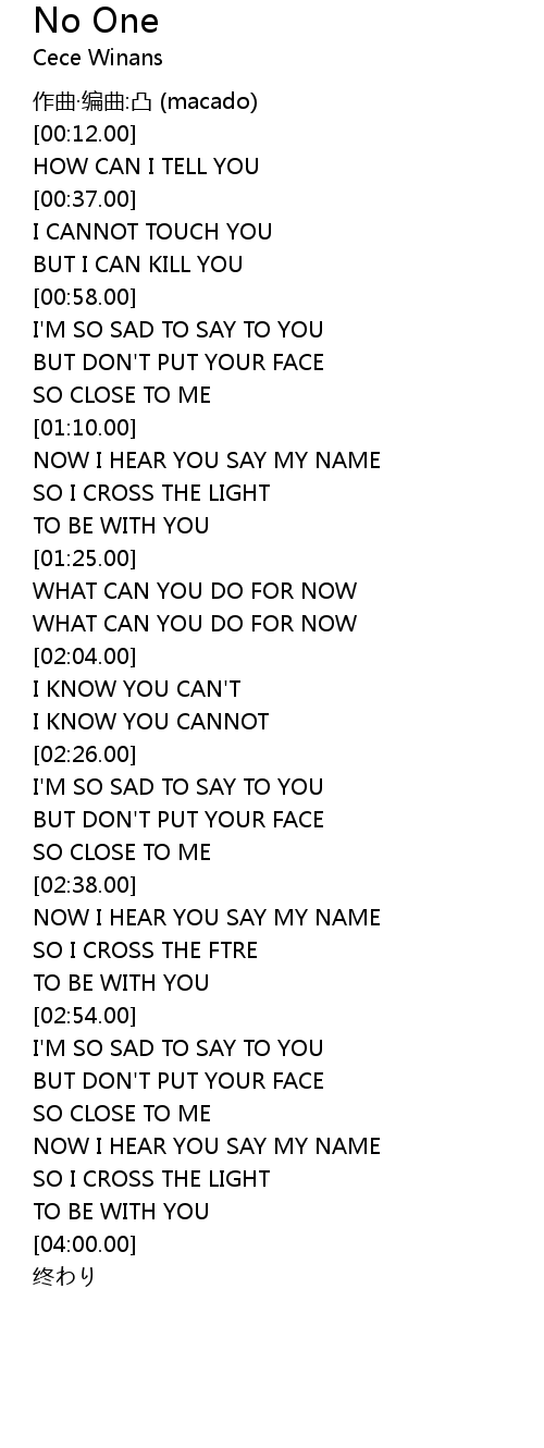 | [03:47.00] | NOW I HEAR YOU SAY MY NAME |