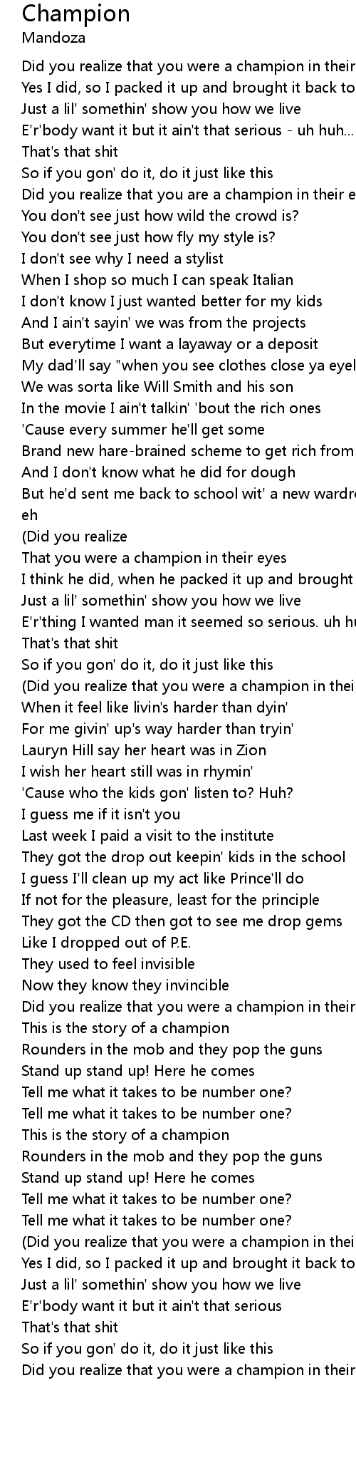| [00:19.98] | Did you realize that you are a champion in their eyes? |