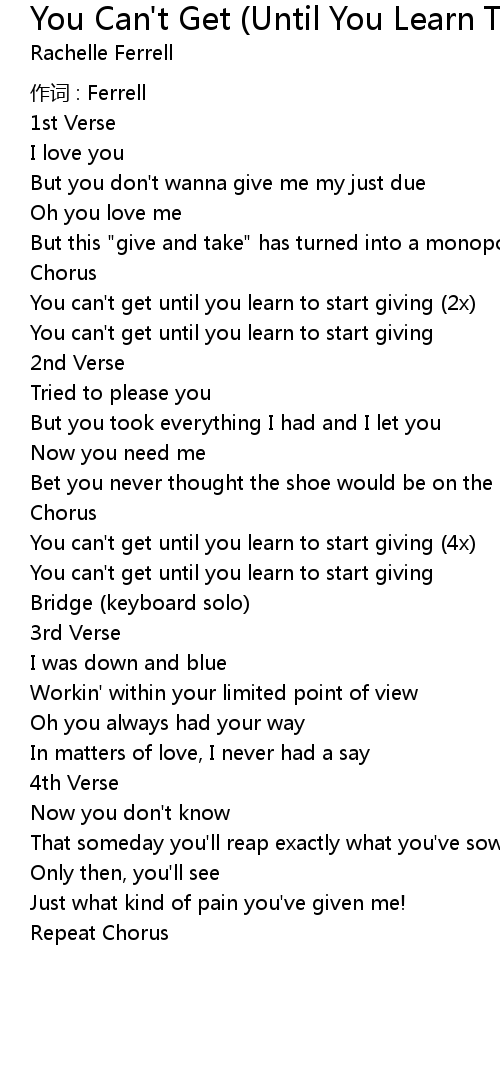 | Song | You Can't Get (Until You Learn To Start Giving) |