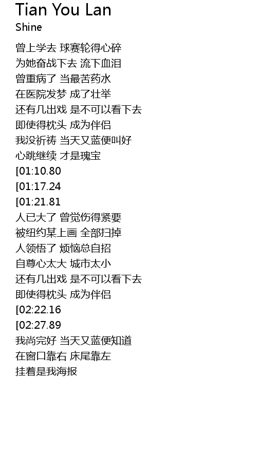 | [03:10.20][02:22.16] | wo mei qi dao dang tian you lan bian jiao hao |