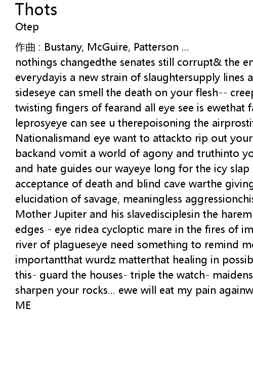 | nothings changedthe senates still corrupt the emporer remains insaneand everydayis a new strain of slaughtersupply lines are less protectedevil on all sideseye can smell the death on your flesh creeping intrapped within the twisting fingers of fearand all eye see is ewethat facethose eyesburning like leprosyeye can see u therepoisoning the airprostituting | |