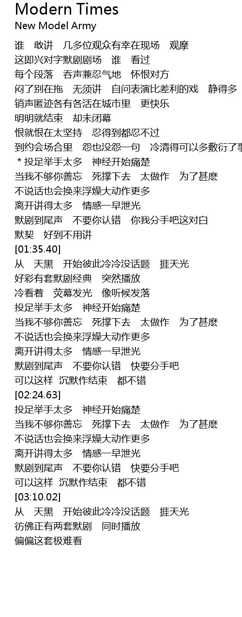 | [01:21.46] | 默剧到尾声 不要你认错 你我分手吧这对白 |