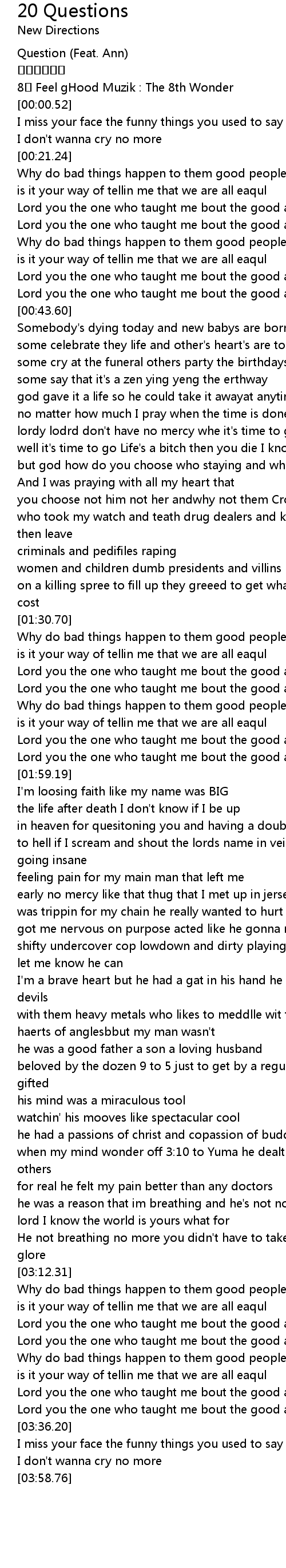 | [01:38.03] | Why do bad things happen to them good people |