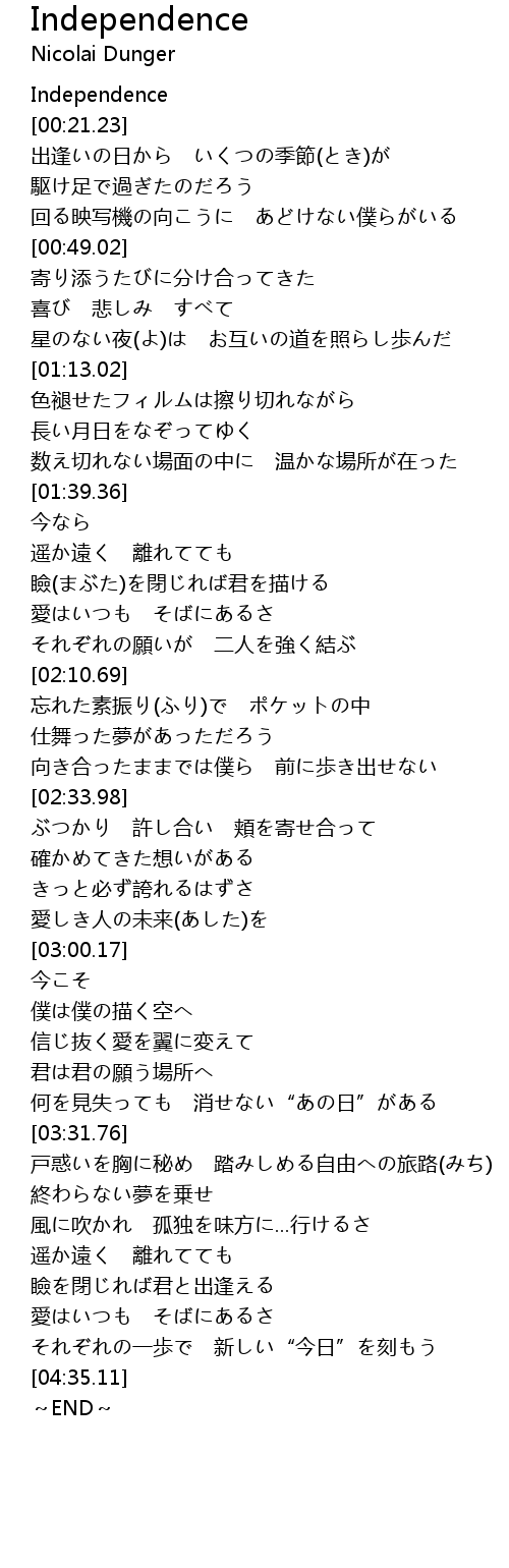 | [03:35.62] | 戸惑いを胸に秘め 踏みしめる自由への旅路(みち) |