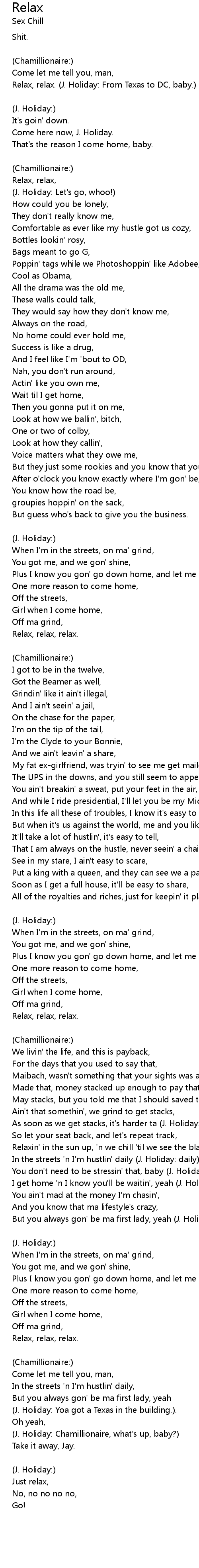 | As soon as we get stacks, it's harder ta (J. Holiday: relax, relax), | |